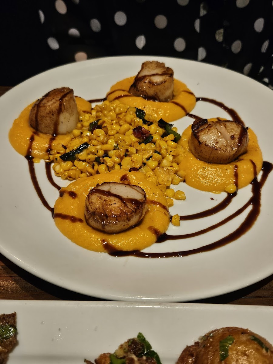 For those craving something from the sea, indulge in the Pan Roasted Wild Salmon, beautifully paired with braised escarole and white beans, or the luxurious Pan Seared Eastern Diver Scallops served with a rich chorizo corn mix and butternut squash puree. Each bite is an explosion of flavor that demonstrates the chef's dedication to quality and artistry.